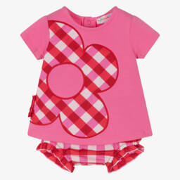 Vibrant fuchsia pink dress for girls by Agatha Ruiz de la Prada, made in soft cotton jersey. The top has a large tulle bow on the front patterned with dots and hearts, with a matching tulle skirt. Slipping easily over the head, this comfortable style is complete with a soft jersey lining.