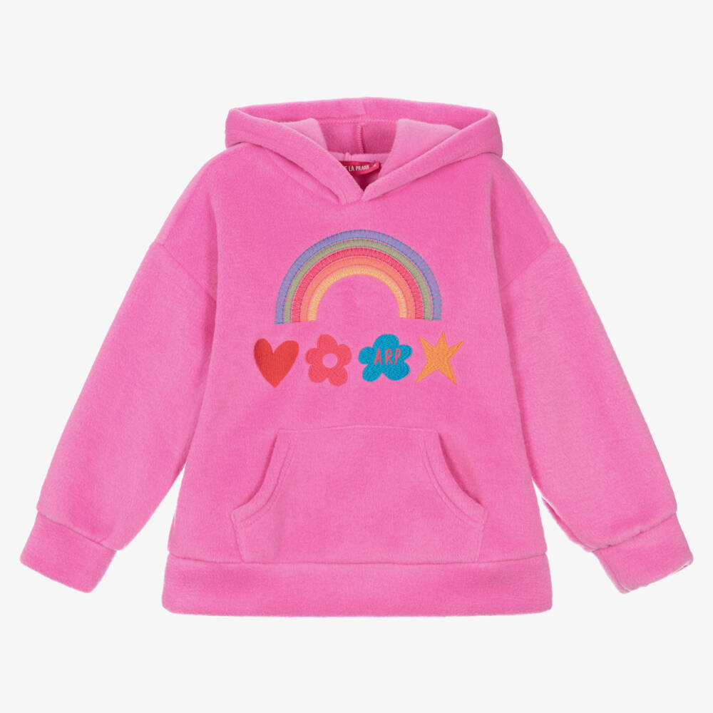 Beautifully soft, this fuchsia pink fleece hoodie for girls is by Agatha Ruiz de la Prada. Warm and cosy, it has an embroidered rainbow on the front, with colourful shapes below featuring the designer's logo. A useful pouch pocket on the front completes the comfortable, casual style.