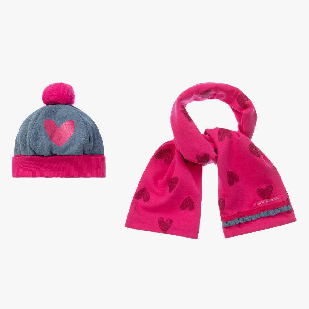 Sweet pink hat and scarf set for girls by Agatha Ruiz de la Prada, made in soft cotton blend jersey. The cute hat has blue denim effect with an elasticated trim for comfortable wear. It has a fluffy pink pom-pom on the top and a sparkly heart printed on the front. The matching scarf is printed with glitter hearts and has a delicate blue trim for a coordinated look.