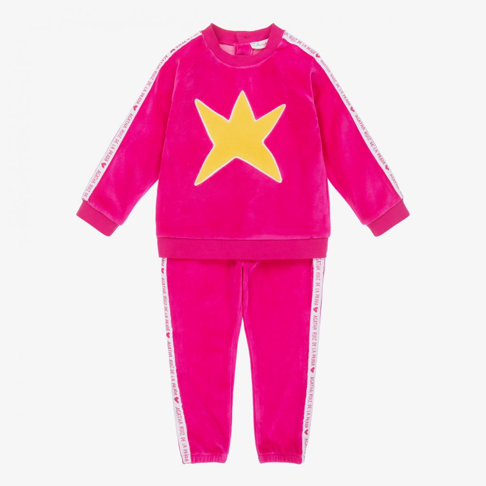 Pink tracksuit for girls by Agatha Ruiz de la Prada, made in soft velour. The top has a yellow and white star on the front, with white and pink logo tape trims on the sleeves and button fastenings on the back. The joggers have white and pink logo tape trims on each leg and an elasticated, ribbed waistband with a faux drawstring.