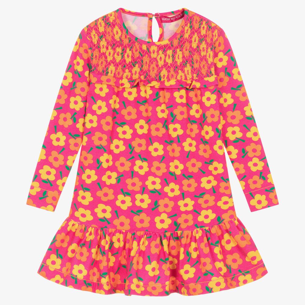 Lovely pink and yellow dress for girls by Agatha Ruiz de la Prada, made in soft cotton jersey. Printed with a gorgeous flower pattern, this easy-to-wear dress has a shirred, ruffle trim on the shoulders for style and stretch. For a cute finish, there is a keyhole button fastening on the back.
