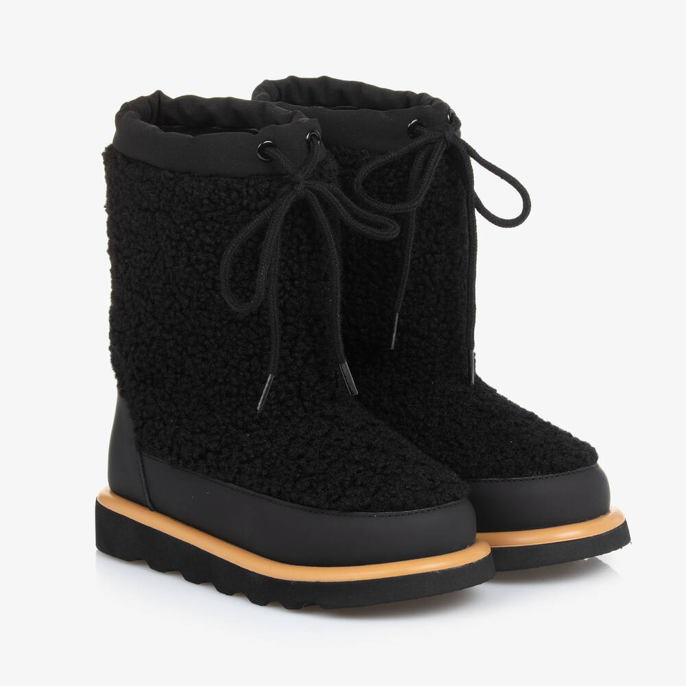 Black snow boots for boys and girls by Age of Innocence, ideal for cold weather styling and après ski looks. Handcrafted in soft bouclé fleece with a cosy faux fur lining and insole, they have an adjustable drawstring fastening around the ankle. The upper is trimmed with faux leather and they have a chunky non-slip rubber sole, textured for added grip.