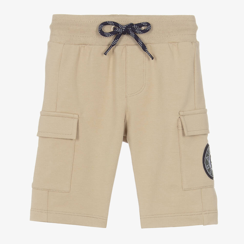 Beige cargo shorts for baby boys from German label AIGNER, made in soft mid-weight cotton jersey. Comfortable to wear, they have a stretchy elasticated waistband with drawstring ties to ensure a great fit. For designer appeal, the brand's signature 'A' horseshoe logo patch can be seen on one of the cargo-style pockets.