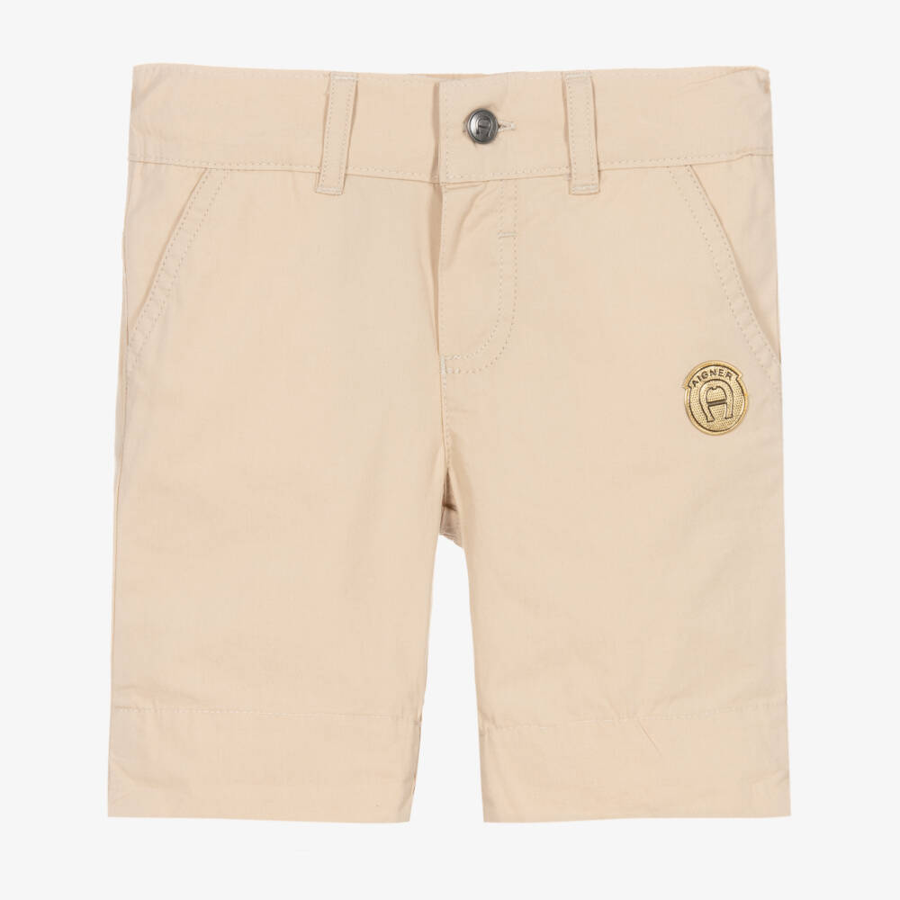 Beige Bermuda length shorts for baby boys by AIGNER. A casual style with slanted pockets on the front and welt pockets on the back, they are made in lightweight cotton for cool and comfortable wear. The waistband is adjustable for a good fit and they fasten with a branded button. For a signature finish, the designer's golden 'A' horseshoe logo patch is on the front and the turn-up cuffs are patterned with a subtle beige logo print.
