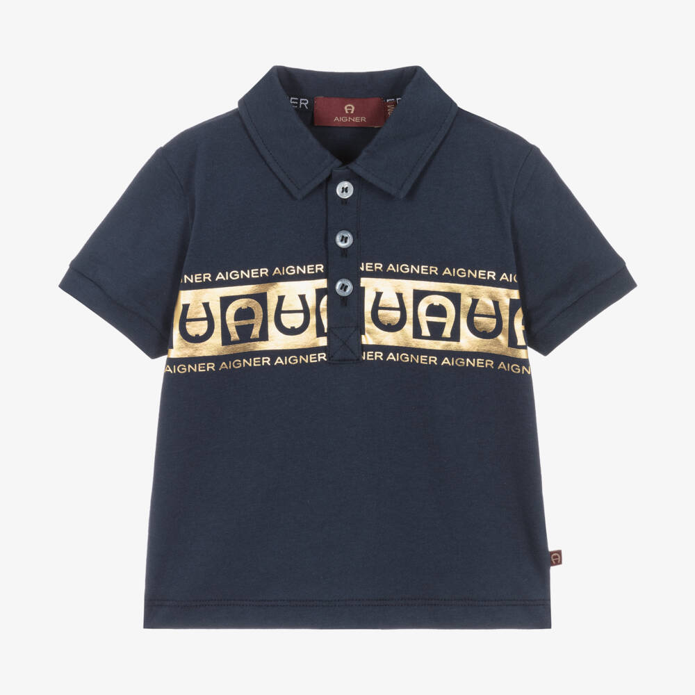 Navy blue short-sleeved cotton polo shirt for baby boys by AIGNER, made in soft, comfortable jersey. Unmistakably by the brand, across the front it has repeat shiny gold logos and the signature 'A' horseshoe logos. There are white logo button fastenings on the front.