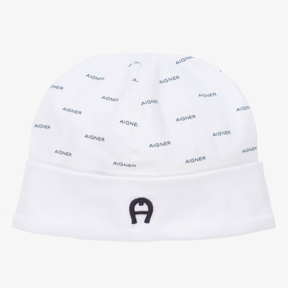 Super soft white Pima cotton jersey baby hat for boys by Aigner. This lovely layette hat features an all-over signature print in navy blue, with an embroidered 'A' horseshoe logo on the brim and a logo tag stitched on the back.