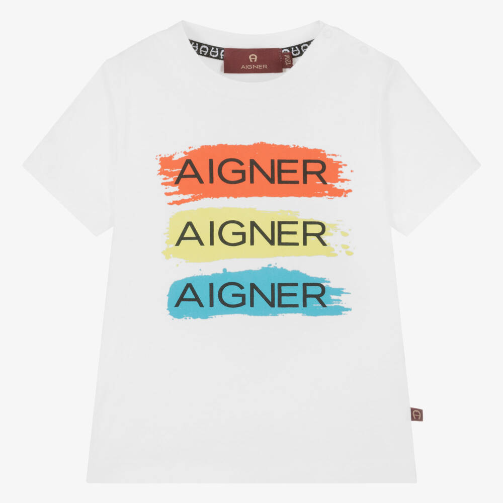 White cotton short-sleeved T-shirt for baby boys by German brand AIGNER, with a trio of painted logo stripes printed in red, yellow and blue. Made in comfortable jersey, it has popper fastenings on one shoulder to make dressing easy and a logo tab on one side seam.