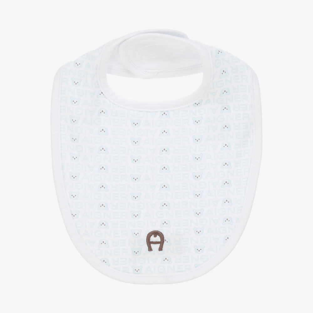 White bib for baby boys by AIGNER, patterned with a pale blue logo and teddy bear design. Made in wonderfully soft Pima cotton jersey, this useful feeding accessory has the brand's signature 'A' horseshoe logo embroidered on the front in brown. It fastens easily with velcro on the back of the neck.