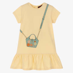 Adorable pastel green dress for baby girls from AIGNER, made in soft and comfortable cotton jersey with short sleeves and a ruffle hem. This casual style features a playful bag print on the front embellished with colourful flowers and the brand's signature logo prints. For easy dressing, it fastens with poppers on the back.