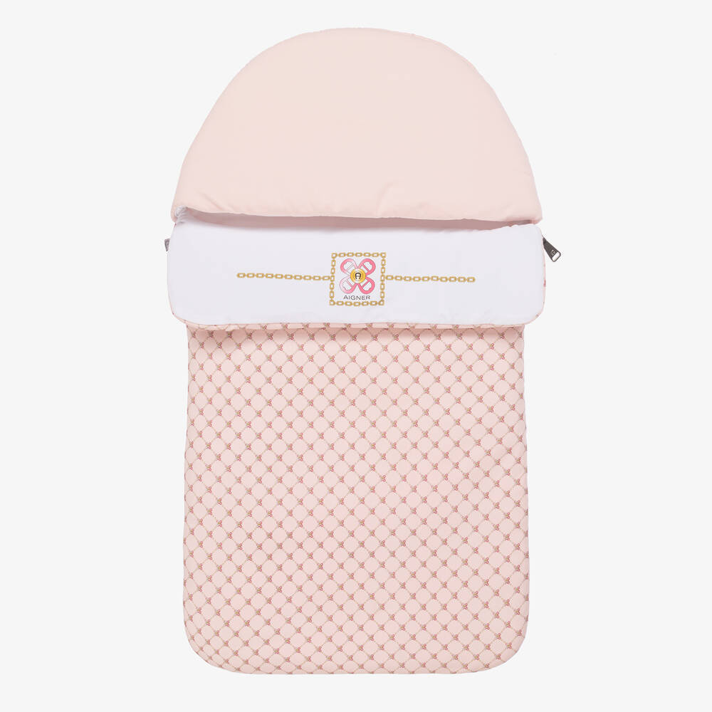 Pink nest for baby girls by AIGNER, made in super soft Pima cotton jersey. Warmly padded, with a cosy hood, it has a zip fastening down one side and along the base for easy access. For a distinctive finish, it is patterned on the front with a geometric chain design featuring the brand's signature 'A' horseshoe logos with a coordinating logo pattern on the fold-down front.
