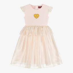 In sweet pastel colours, a sleeveless A-line dress for baby girls by AIGNER. It is made from delicate crochet style lace in a zigzag striped pattern with pale coral pink cotton jersey trims. Down the front, it has blue and pink flower appliqués embroidered with the brand's signature 'A' horseshoe logo in purple. It is fully lined in ivory cotton voile for comfort and fastens with a seamless zip on the back.