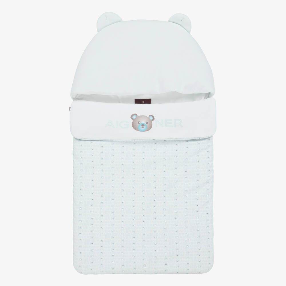 Pale blue nest for baby boys by AIGNER, patterned with a blue logo and teddy bear design. Made in beautifully soft Pima cotton jersey, it is gently padded for warmth and fastens with a zip down one side and across the base. It has a branded fold-down front and little 3D ears on the top of the hood for a cute finish.