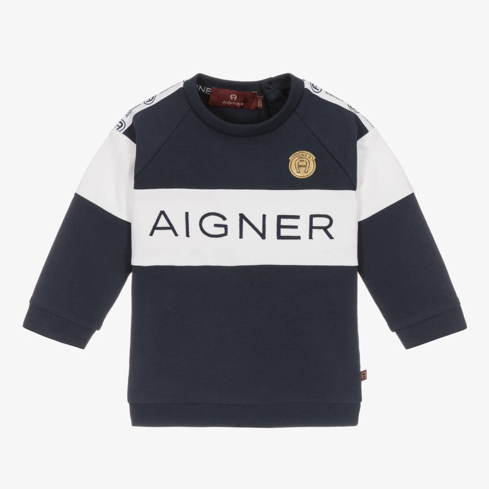Navy blue and white sweatshirt for boys by AIGNER, made in a lightweight sweatshirt jersey. Making a statement, it has the brand's logo embroidered on the front, and a gold foil textured monogram on the chest. A signature 'A' horseshoe logo print on the shoulders gives a distinctive designer finish. Comfortable and casual to wear, this crew neck has easy-to-fasten poppers on the back.