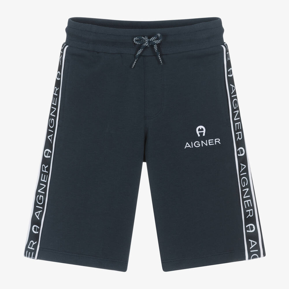 Синие хлопковые шорты для мальчиков от AIGNER с фирменными лентами. Эти повседневные шорты из мягкого трикотажа имеют белую вышивку логотипа спереди с фирменной подковой 'A'. Удобные карманы скрыты в боковых швах, а пояс на шнурке обеспечивает комфортную посадку.