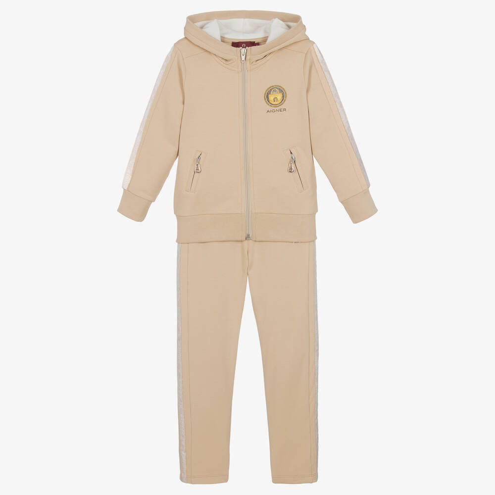 A beige tracksuit for girls by AIGNER, made from soft and lightweight cotton jersey. The hooded zip-up top has a glittery gold handbag motif on the chest, with logo taped sleeves for added casual glam. The brand's signature 'A' horseshoe logo is subtly featured on the zip-up pockets. This logo is decorated in diamanté's on the matching trousers, which are comfortably finished with an elasticated waist.