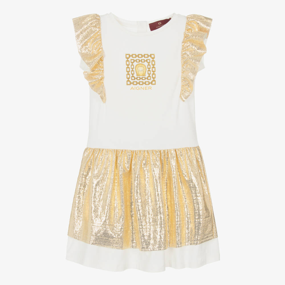Beautiful ivory dress for girls by AIGNER, made in soft cotton jersey. Ideal for a party, it has luxurious, statement metallic gold ruffles on the sleeves and the skirt. For a glamorous touch, it has a metallic gold, glittery logo motif on the chest. It fastens with simple buttons on the back for easy dressing.