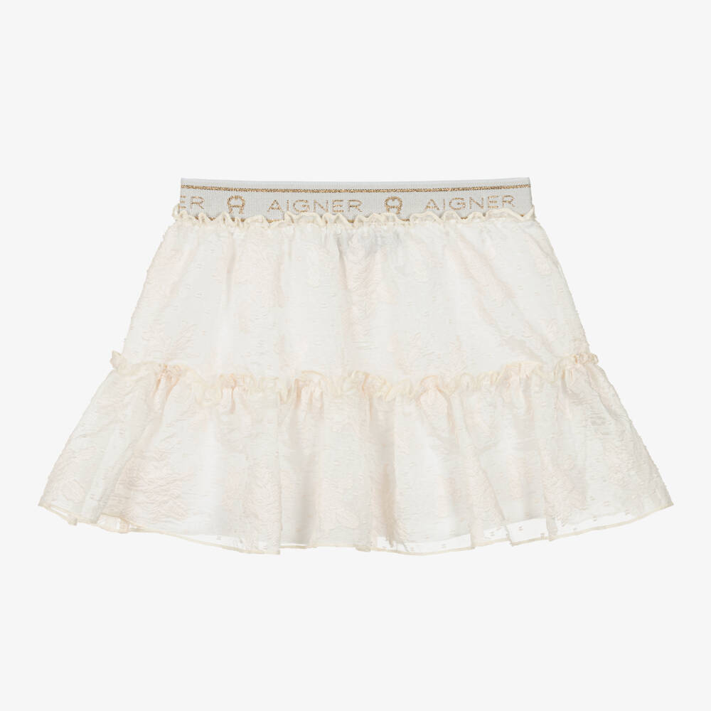 Younger girls pretty ivory skirt by AIGNER, made from soft organza with a delicate floral jacquard design. Fully lined, it has a frilly hem for a feminine look and a comfortable elasticated waistband woven with glittery gold logos for a designer finish.