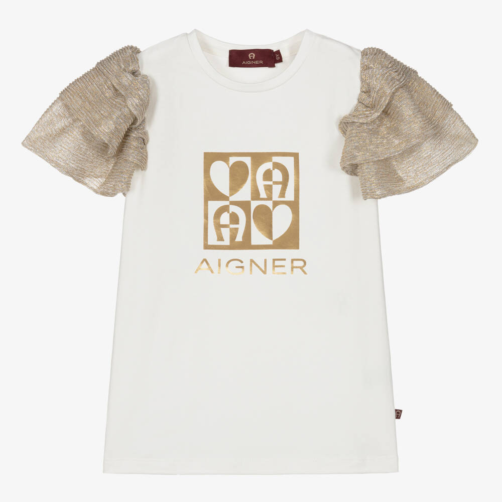 Girls pretty ivory cotton top by AIGNER, with elegant gold plissé sleeves. Made from soft and stretchy jersey for a comfortable fit, it is printed with a gorgeous, signature 'A' horseshoe metallic gold motif on the chest.