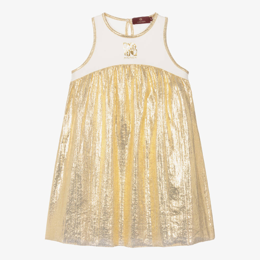 Stunning ivory and gold dress for girls by AIGNER, ideal for a stand-out, party look. The comfortable jersey bodice has a cute heart logo motif on the chest, with a keyhole button fastening on the back for simple, stylish dressing. The floaty, metallic gold skirt adds a luxe finish to this sleeveless style.