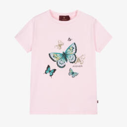 Pretty pink T-shirt for girls by AIGNER, made in soft cotton jersey. For instant designer appeal, it features a striking blue butterfly graphic on the front, with a black logo print.