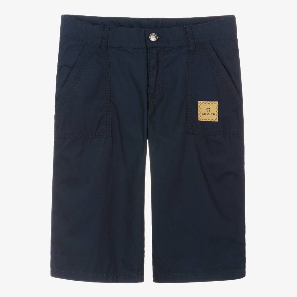 Stylish Bermuda-length navy blue cotton shorts for teen boys by German brand AIGNER. A golden logo patch on one of the front pockets adds instant designer appeal to these comfortable, lightweight shorts. They fasten with a pewter-coloured logo button and zip and have a further flapped pocket on the back.
