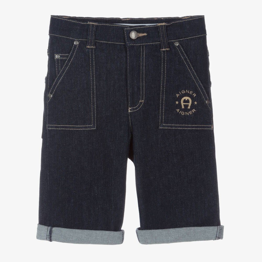 Dark blue Bermuda length denim shorts for teen boys by AIGNER. Smooth and stretchy, they have a signature 'A' horseshoe logo embroidered in eye-catching shimmery gold thread on the front. Inspired by the brand's logos, they have embossed rivets and contrast beige stitching. Relaxed and casual, they have an adjustable waist and turned-up cuffs.