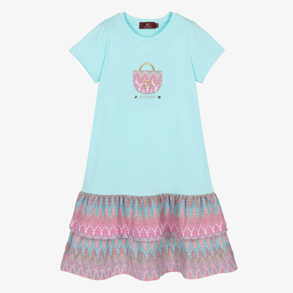 Eye-catching aqua blue cotton dress for teen girls by AIGNER, which could be worn for both casual and special events. It has a lacy, zigzag knit handbag appliqué on the front in pink, blue and beige, with glittery gold thread in the weave, an embroidered gold, signature 'A' horseshoe logo and sparkly gold heart charms. Made in comfortable jersey, it has a frilled, drop-waisted, coordinating lacy-knit skirt. Easy to wear, it simply pulls on.