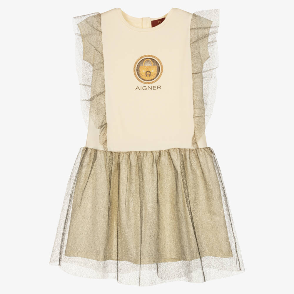 Ivory dress for teen girls by AIGNER, with a glittery black and gold bag logo print on the front, featuring the brand's signature 'A' horseshoe motif. Casual, with a smart, edgy look, it is made in soft cotton jersey, with a black and gold tulle overlay on the skirt and matching ruffle trims over the shoulders. It fastens with branded buttons on the back.