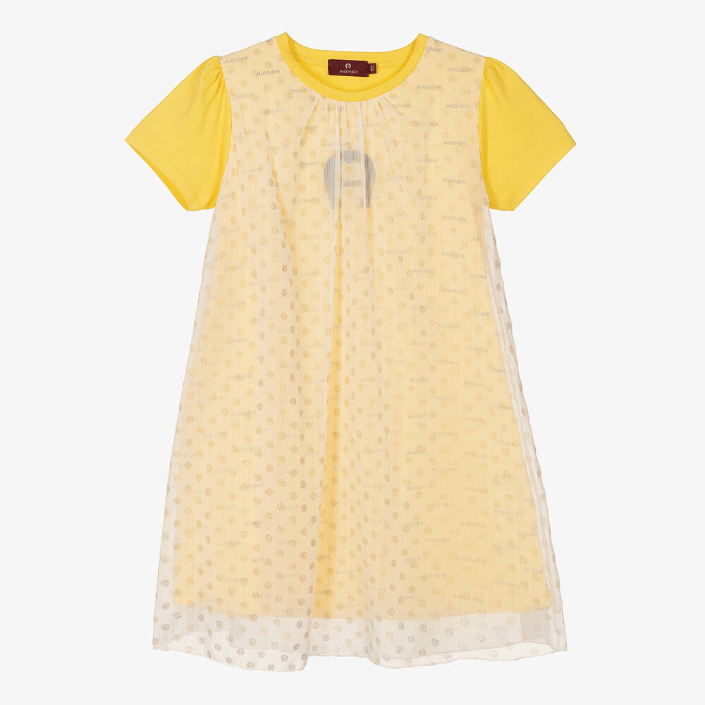 Easy wearing yellow chiffon and jersey dress for teen girls by AIGNER. The white chiffon overlay is patterned with shiny gold polka dots. Made in comfortable stretchy jersey, it has pretty puffed sleeves and is printed with black logos. The brand's large signature 'A' horseshoe logo is on the chest.