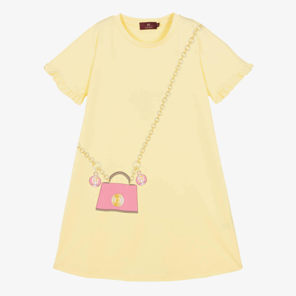 Pale yellow cotton dress for teen girls by AIGNER, made in soft, comfortable jersey. It has short, seamless sleeves with feminine frills on the cuffs, and a pink and gold crossbody bag print on the front, with a gold chain bearing the brand's signature 'A' horseshoe logo charms. Easy to wear, it has a slightly flared silhouette and simply slips on over the head.