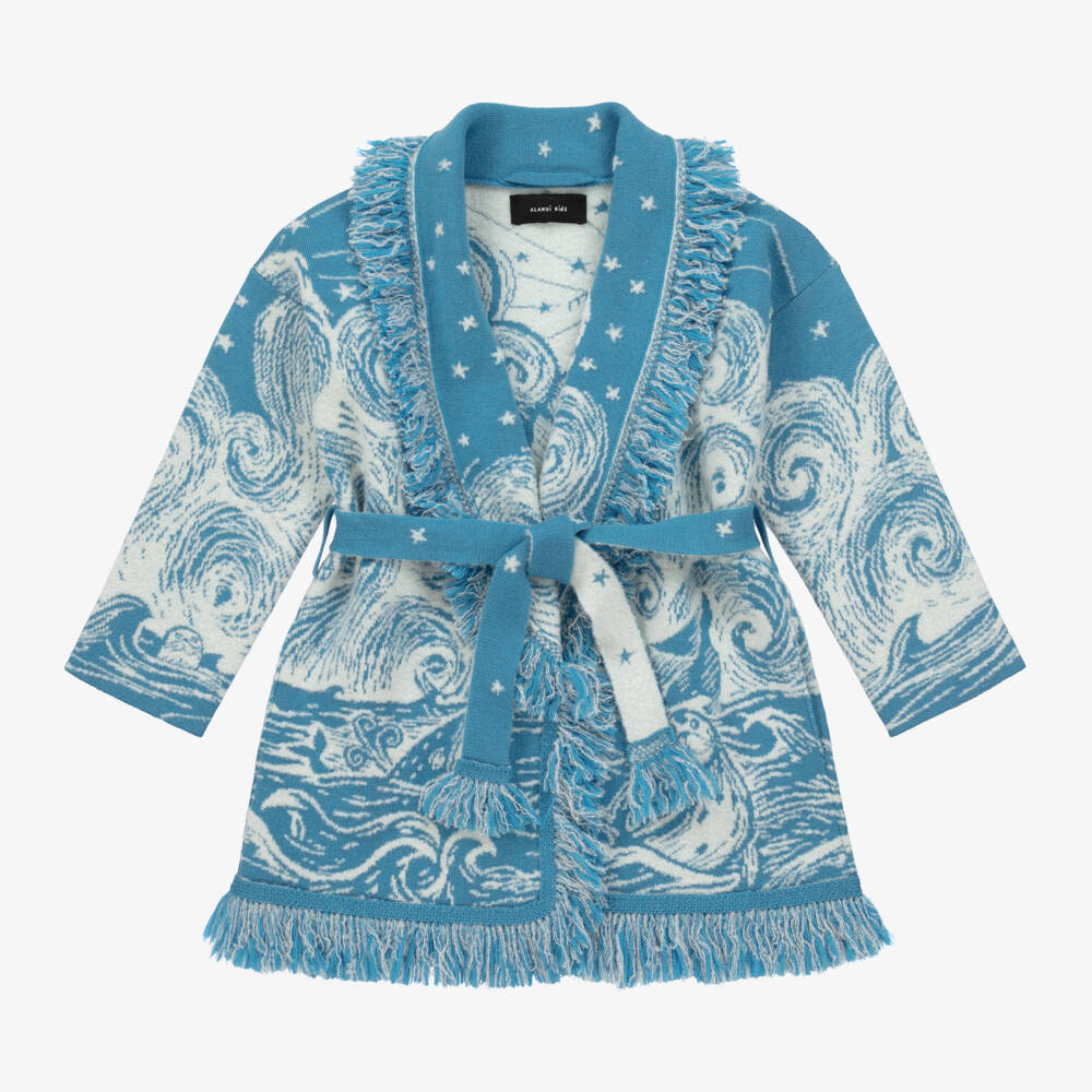 Mini-me blue icon cardigan for boys and girls, designed by luxury Italian label Alanui. This cardigan is a signature style for the brand, exquisitely crafted in Italy using the finest virgin wool in a double jacquard knit. A distinctive statement piece, it has a magical Antarctic ocean pattern and delicately fringed edges. It can be worn with an open front or with the matching tie belt for an effortlessly stylish silhouette.