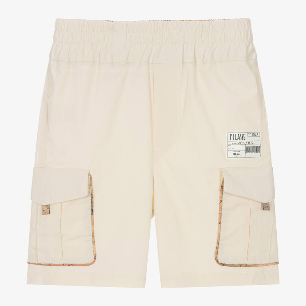 Casual pale beige cotton shorts for boys by luxury Italian brand Alviero Martini, with a hint of stretch for comfort. They are trimmed with the designer's dark beige Geo map print on the cargo pockets and on the inside of the elasticated waist. Inspired by airport luggage tags, they have a white logo label sewn on the front.