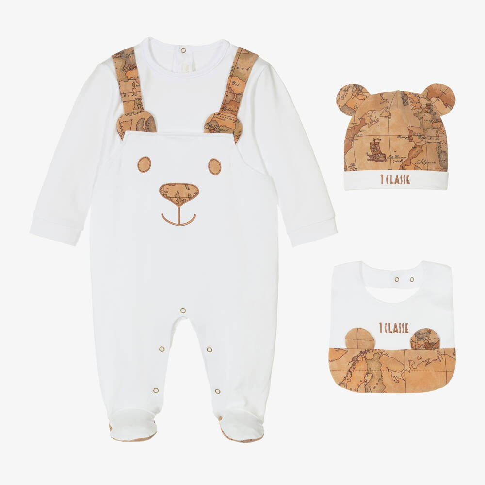 An adorable white babygrow set for boys and girls by Alviero Martini, made from the softest cotton jersey. Each decorated with cute teddy bear ears, this outfit is patterned in the brand's distinctive beige Geo map print. The babygrow has a dungaree style design with an embroidered face, while the hat and bib have 1a Classe logo embroideries. Easy to fasten, the babysuit and bib have gone-tone popper fastenings.