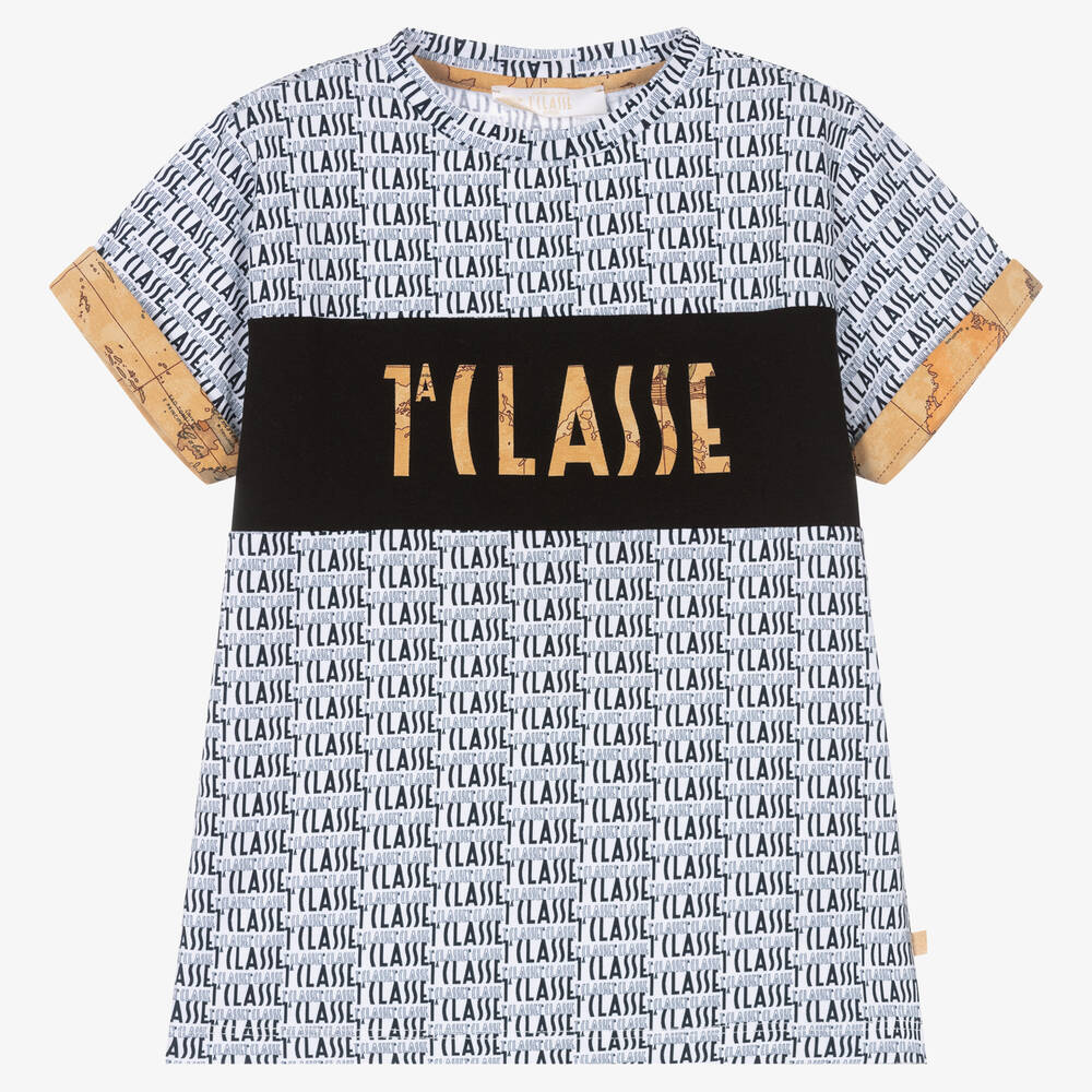Boys Italian-crafted cotton T-shirt from Alviero Martini. A style statement, this white top is patterned with all-over 1a Classe branding in contrast black print. The brand's dark beige Geo map design can be found on the turn-up sleeve cuffs, across the front panel in the form of a 1a Classe logo, and on the side seam tab detail.