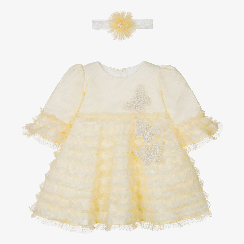 Pale yellow dress set for little girls, by classically styled brand Andreeatex. Made with soft tulle, it has a plumetti design with sweet butterfly appliqués and beautiful ruffled trims. It comes with a white floral lace headband and satin knickers.