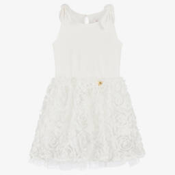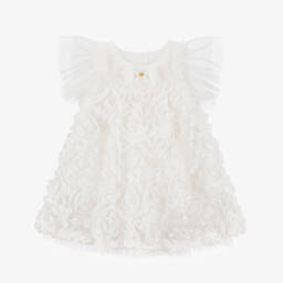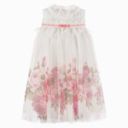 Off-white and pink dress for baby girls by Angel's Face, made in soft tulle with a delicate rose print. Lovely for a special occasion, it has a romantic bow appliqué on the bodice and sweet flutter sleeves. It is lined in soft jersey for comfort against babies' skin and fastens with a neat keyhole button on the back of the neck.
