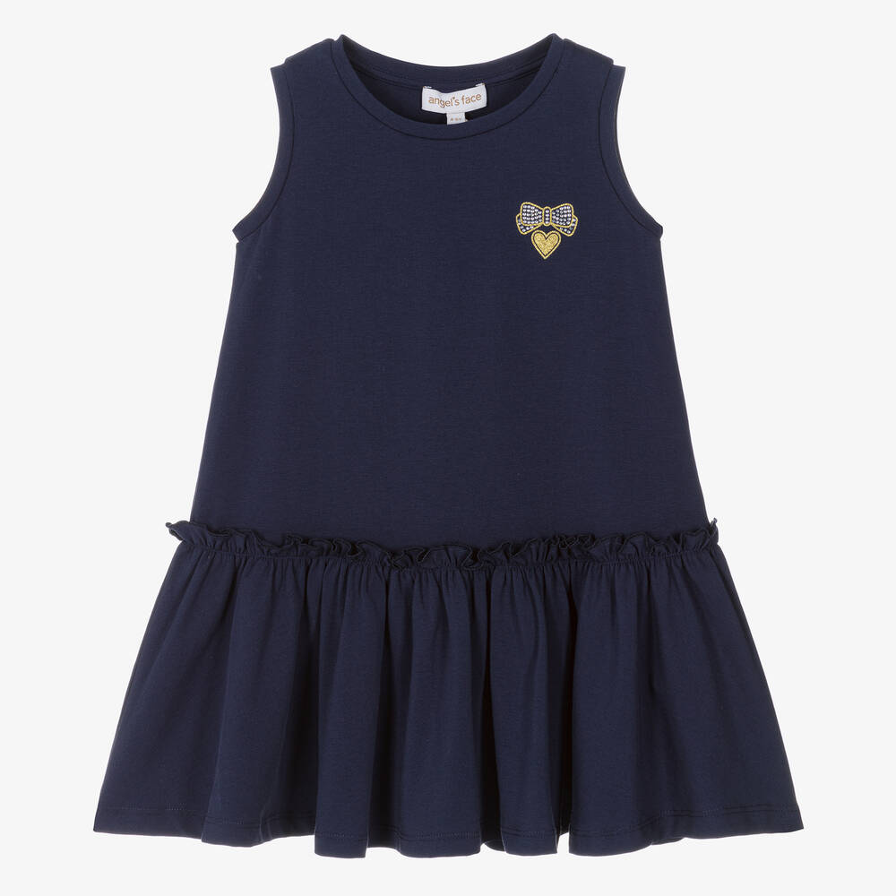 Casual navy blue dress for girls by Angel's Face, made in soft cotton jersey. Cool and comfortable, this sleeveless design has a dropped waist with a ruffle trim and full skirt. It features a small heart and bow on the chest and the brand's signature angel wings on the back in glittery gold and sparkly diamantés.