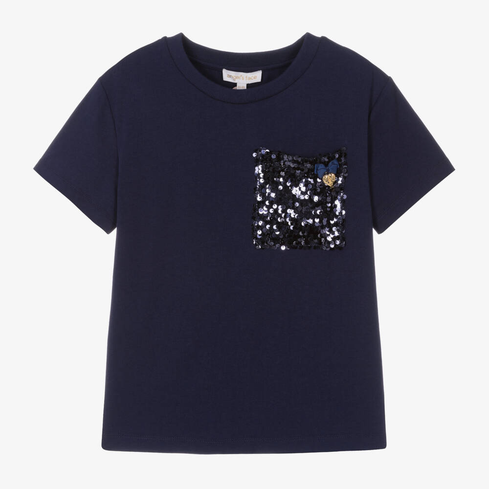A navy blue T-shirt for girls from Angel's Face. This short-sleeved T-shirt is made in super-soft, stretchy jersey, comfortable for daily wear. It has a pocket feature on the front, complete with fabulous sequins and the brand's signature heart charm and bow embellishment.