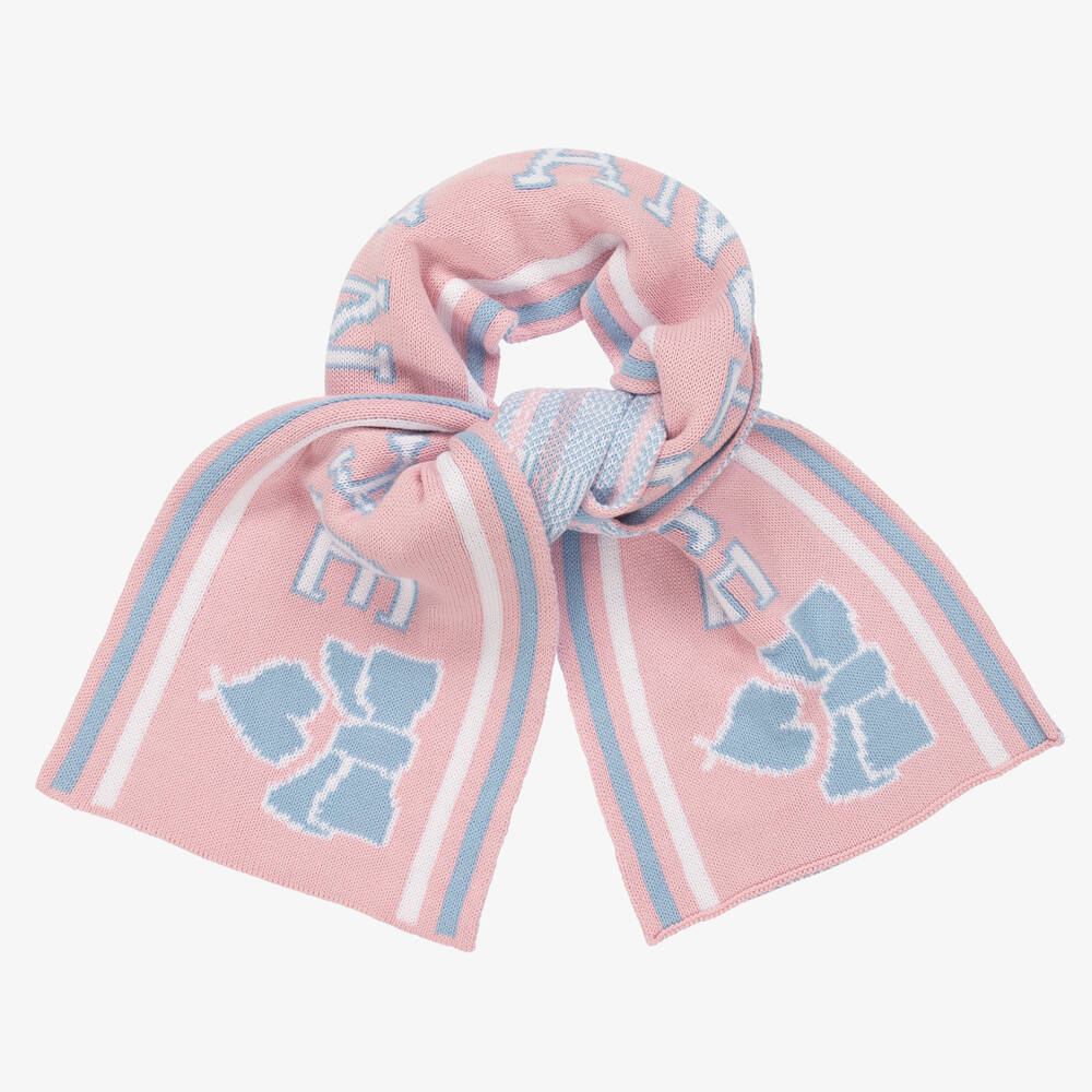 A pale pink and blue knitted scarf for girls from Angel's Face. This cosy accessory is knitted in a double layer of soft cotton for added warmth. It is decorated with a lovely jacquard bow, heart and logo design, bordered by white and blue stripes.