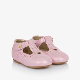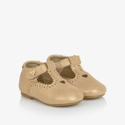 Очаровательные золотистые туфли для первых шагов для малышек от Angel's Face идеальный выбор для особого случая. Изготовлены из мягкой искусственной кожи с нежным мерцающим эффектом, они украшены изящными волнистыми краями и сложной перфорацией с сердечками. Легко застегиваются на липучку, украшенную фирменным золотым бантом и подвеской с логотипом в виде сердца. Внутри мягкая подкладка из искусственной кожи с эластичными вставками для комфорта, слегка амортизирующая стелька и гибкая резиновая подошва для поддержки, идеально подходят для первых шагов.