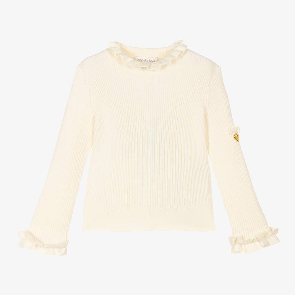 Прекрасный кремовый свитер для девочек от Angel's Face из мягкого хлопкового трикотажа в рубчик. Этот удобный топ с рюшами на воротнике имеет оборки на манжетах и золотое сердечко с бантом на одном рукаве.