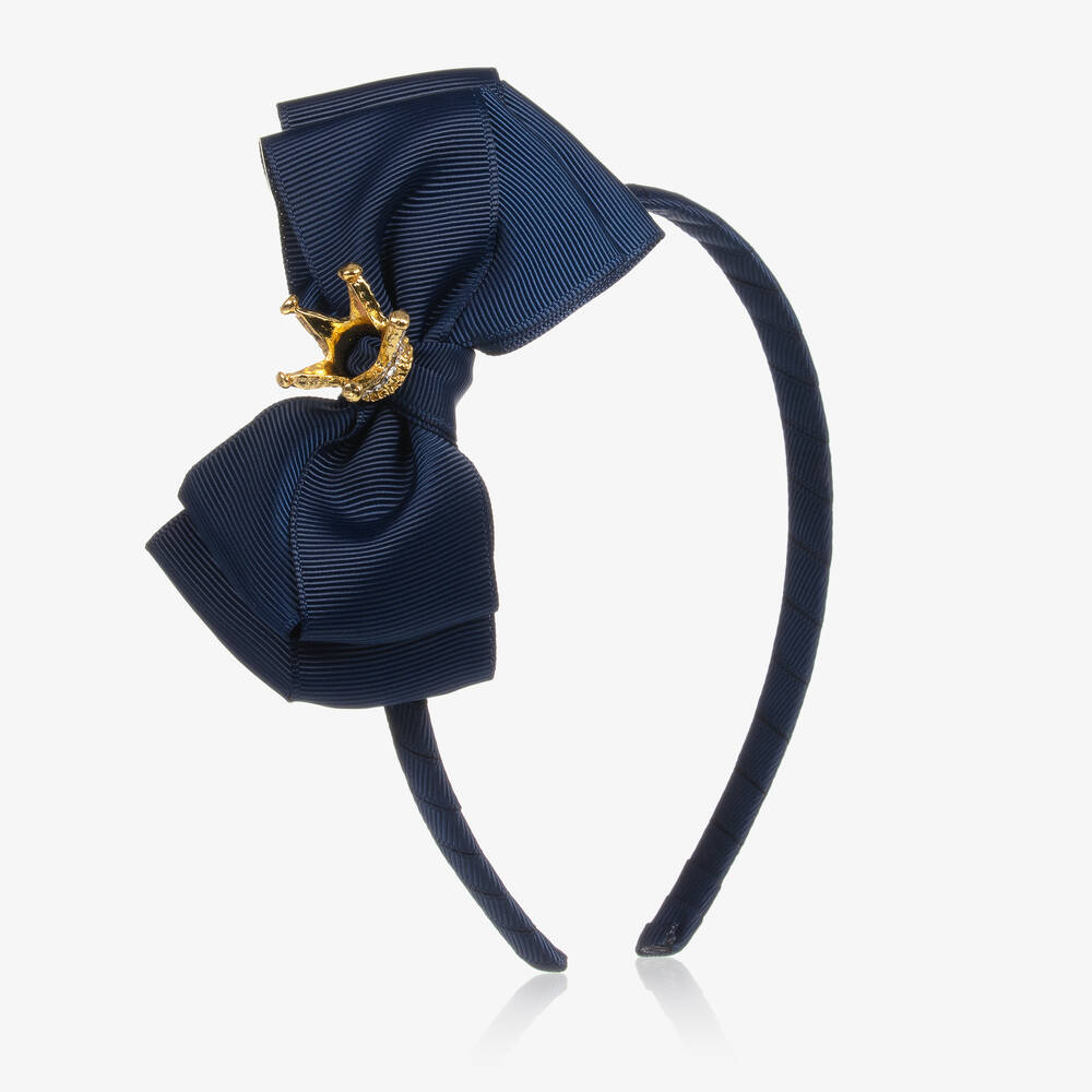 Girls navy blue grosgrain ribbon covered hairband by Angel's Face. It has a pretty grosgrain ribbon bow, with a gold diamanté crown in the centre.