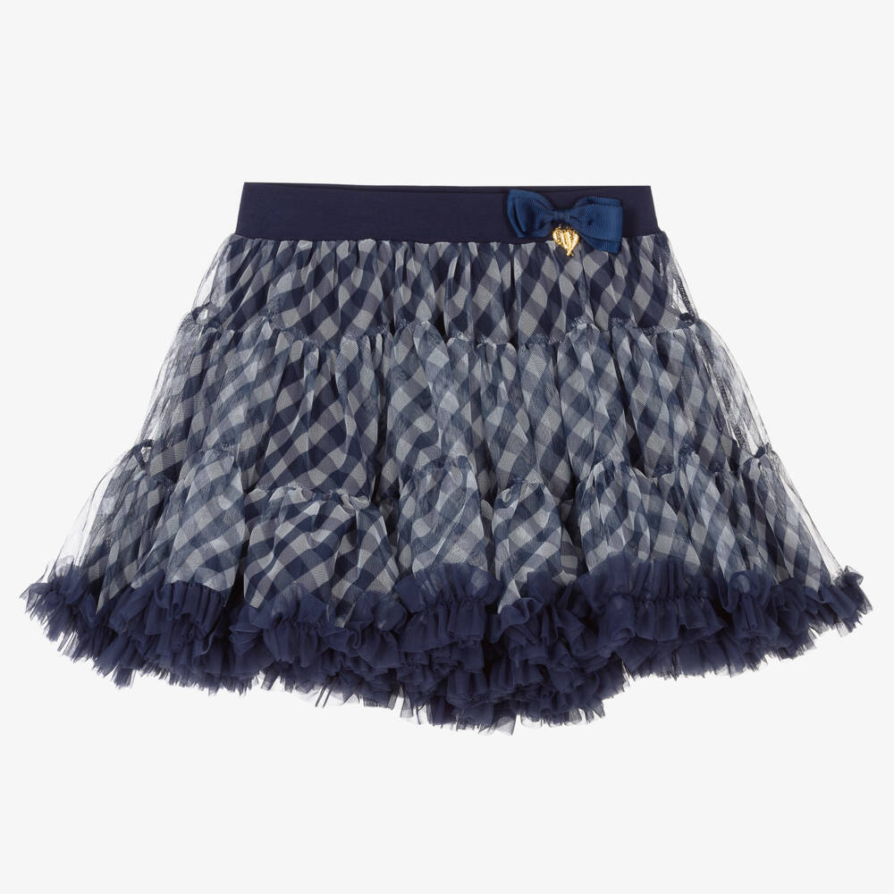 Stunning navy blue and white gingham tutu skirt for girls from Angel's Face. This voluminous skirt is made in layers and ruffles of cascading tulle, with the brand's eye-catching golden heart charm and bow on the front. The elasticated waist and lining are made in soft cotton jersey, comfortable on little tummies.