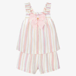 Casual pink shorts set for girls by Angel's Face, made in soft and comfortable cotton jersey. The sweatshirt top features the brand's signature bow and heart charm in tonal pink embroidery. To complete the relaxed look, the shorts have useful pockets and a stretchy elasticated waistband. Beautiful chiffon bows add a lovely finishing touch.
