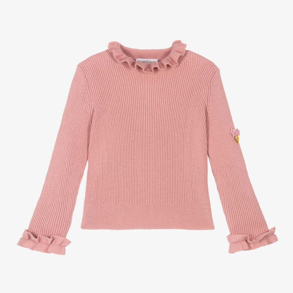 Прекрасный розовый свитер для девочек от Angel's Face из мягкого хлопкового трикотажа. С рюшами на воротнике и манжетах, украшен золотым сердечком и бантиком на рукаве.