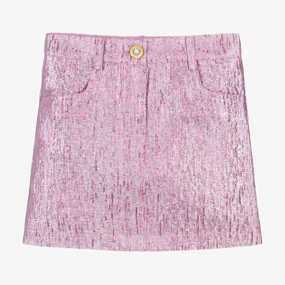 Girls eye-catching metallic pink skirt by Angel's Face, ideal for a party or for elevating an everyday look. The skirt glistens with a tonal pink jacquard pattern and has a shiny golden branded button fastening with a central crystal. There are four useful pockets, and an adjustable waist giving a good fit.