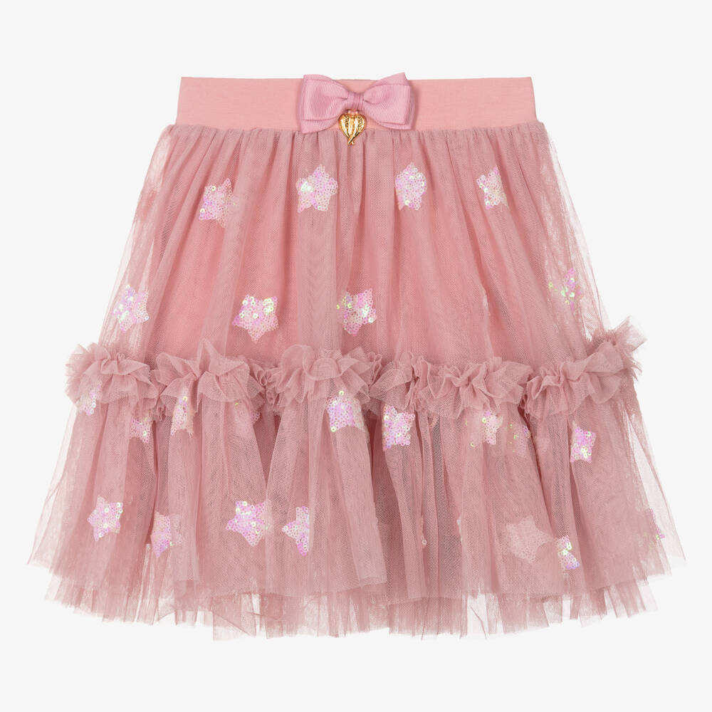 Sparkling with iridescent sequin stars, this pale pink tutu skirt for girls is by British brand Angel's Face. Fun for casualwear and elegant for a special occasion, it has gorgeous ruffle trims and the signature heart charm and grosgrain bow on the front. Made in layers of soft tulle, it has a cotton jersey lining for comfort, with an elasticated waistband for easy pull-on.