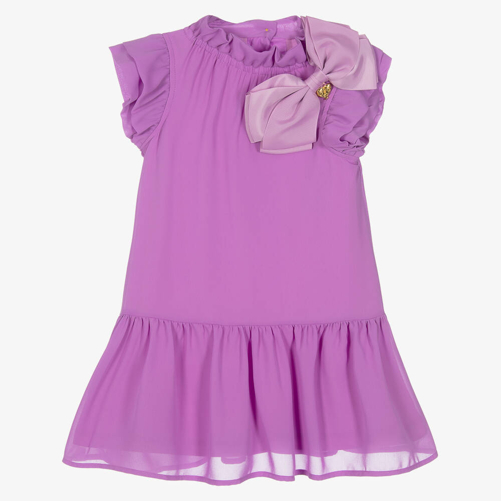Gorgeous purple dress for girls by Angel's Face, crafted in beautifully soft chiffon. Trimmed with feminine ruffles, this stunning dress has a statement bow appliqué on the chest featuring the brand's signature gold heart charm. In a floaty silhouette, it fastens with glamorous gold logo buttons on the back. The lining is made in a luxuriously soft modal jersey blend for stylish comfort.