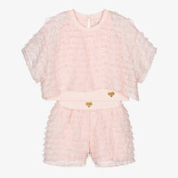 Яркий желтый комплект для девочек от Angel's Face из комфортного хлопкового джерси. Милый топ на бретелях с тонким тюлевым покрытием и красивыми оборками, украшенными радужными пятнами для радостного, сверкающего вида. Эластичные шорты из джерси с подходящими оборками, фирменным бантом и золотым сердечком на каждом манжете, придающими уникальный вид.
