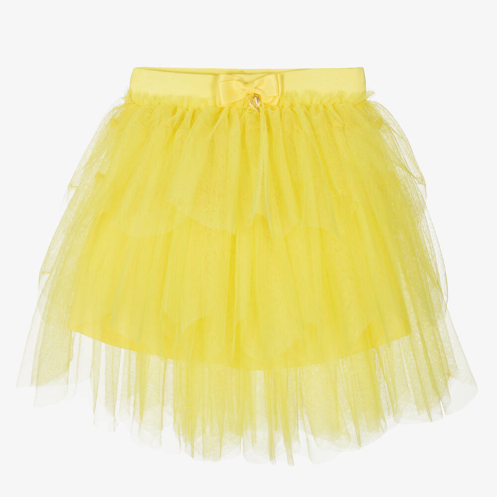 Girls bright yellow tutu skirt by Angel's Face, featuring the signature golden wings heart and grosgrain bow on the waist. The voluminous tulle layers are delicately shaped like sweet flower petals, making it lovely for a party or special occasion. It has a soft cotton jersey lining and elasticated waist for comfort.